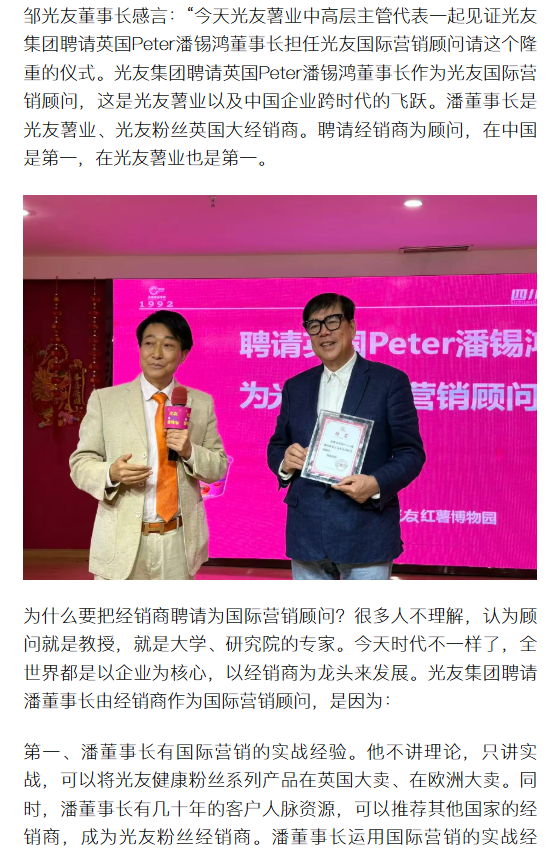 轉(zhuǎn)載搜狐網(wǎng)-光友薯業(yè)攜手國(guó)際營(yíng)銷顧問 讓中國(guó)健康粉絲登陸全球超市