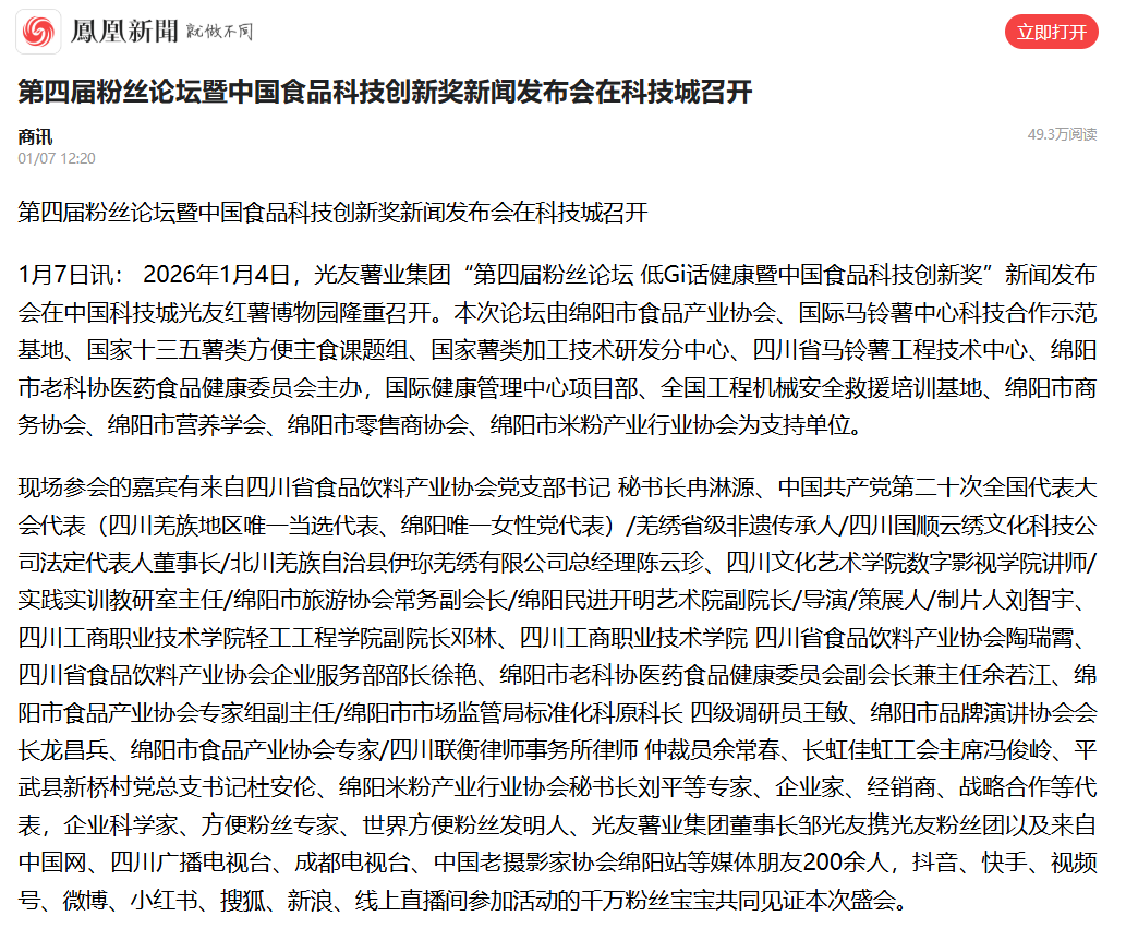 轉載鳳凰網 第四屆粉絲論壇暨中國食品科技創(chuàng)新獎新聞發(fā)布會在科技城召開